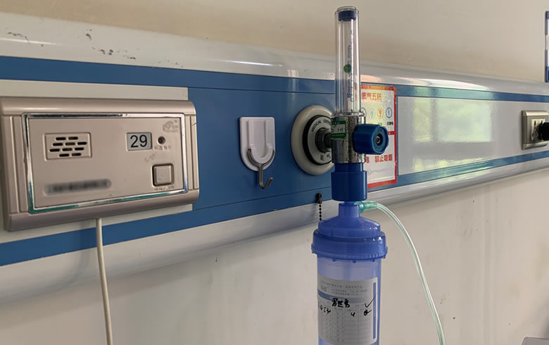 病房床頭安裝鋁合金設(shè)備帶,氧氣管道隱藏在其中,每個(gè)床頭安裝氧氣快速插座,可以用濕化瓶連接吸氧。濕化瓶里會(huì)裝純凈水,通過(guò)水濕化吸入使用時(shí)避免干燥不適。