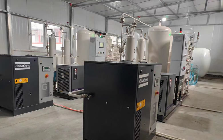 醫(yī)用制氧機(jī),使用空壓機(jī)收集環(huán)境空氣,通過(guò)分子篩選出氧氣儲(chǔ)存和供應(yīng),氧氣濃度約93%,輸送至管道的壓力大約0.5map.