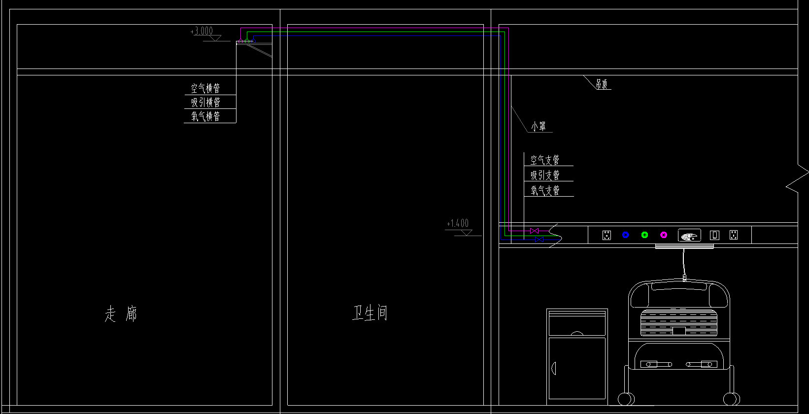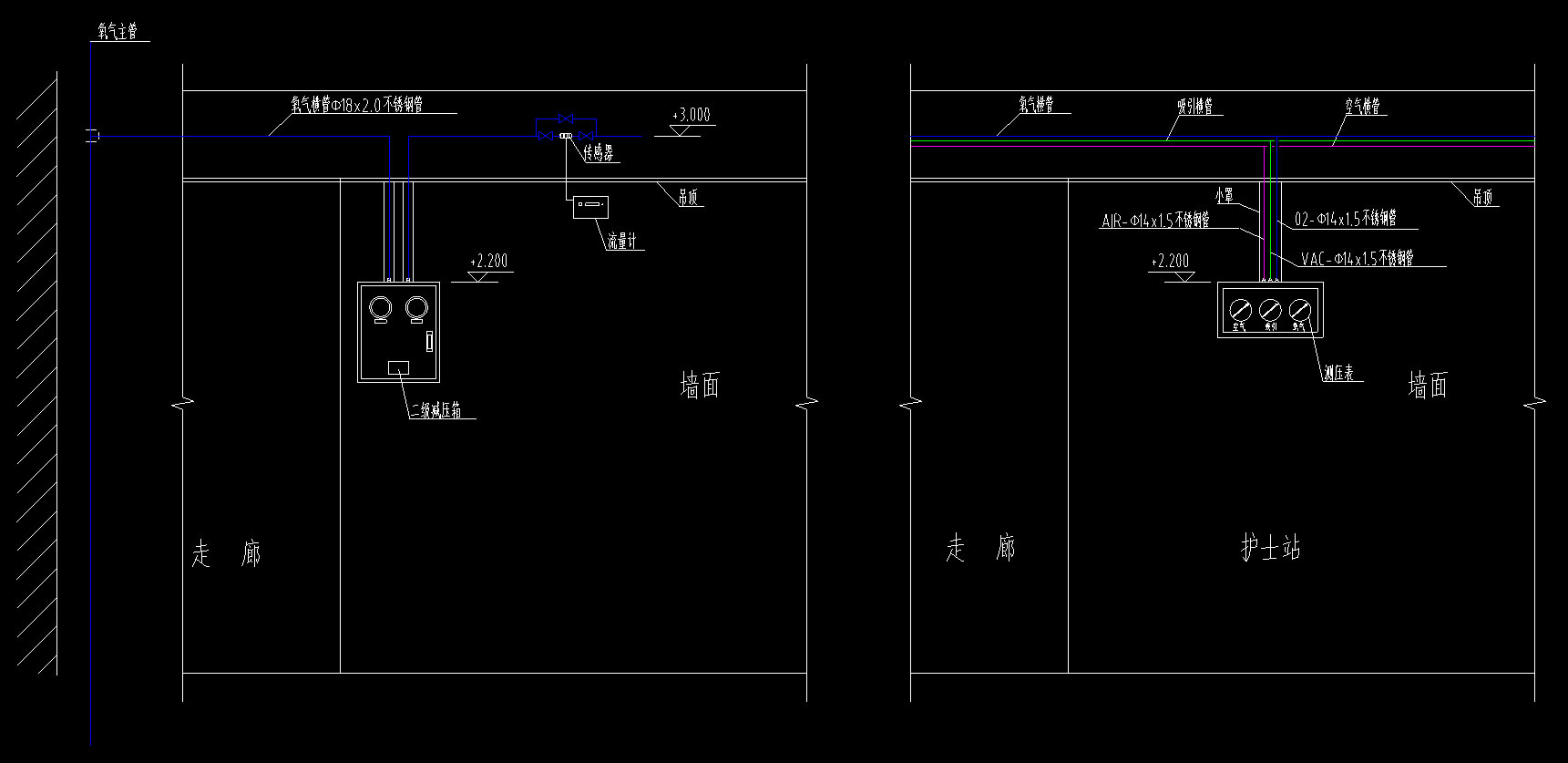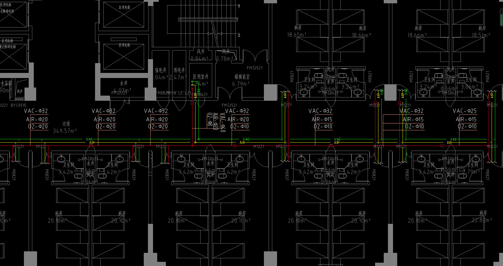 醫(yī)用氣體管道井、走廊中心供氧管道、負壓吸引管道、壓縮空氣管道走向及管徑規(guī)格、病房設(shè)備帶大樣圖等。