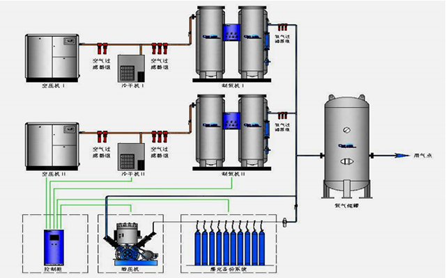 醫(yī)院中心壓縮空氣系統(tǒng)機(jī)組一般采用螺旋桿空壓機(jī)、冷干機(jī)、過濾器、儲氣罐等設(shè)備組成,通過管道連接至手術(shù)室、ICU、搶救室以及普通病房。