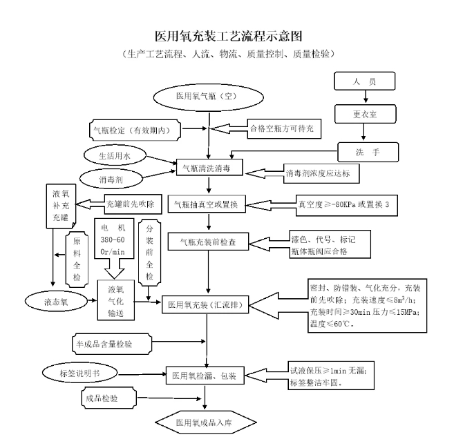 3.檢驗合格的氣瓶按《氣瓶干燥抽真空標(biāo)準(zhǔn)操作規(guī)程》進行空瓶抽真空或置換,操作完畢進行醫(yī)用氧的充裝,充氣前仔細(xì)檢查連接裝置是否牢靠,充氣時隨時觀察壓力表的變化及瓶內(nèi)是否有異響,當(dāng)壓力升高到9.81MPa和12.26MPa時,檢查瓶身溫度不應(yīng)超壓充裝;充氣速度應(yīng)保持在8立方米每小時,且充裝時間不應(yīng)小于30分鐘。