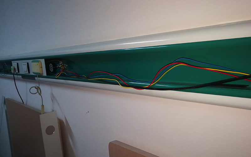 3、為了安裝簡單美觀,一般每個房間的引入管都是從天花板內(nèi)的水平管道引出的,從引出端到進入設備帶的部分管道外用鋁合金蓋覆蓋;鋁合金設備帶安裝了氧氣、氣體截止閥、吸引力、壓縮空氣管道和快速插座,快速插座一般離地1.4m;